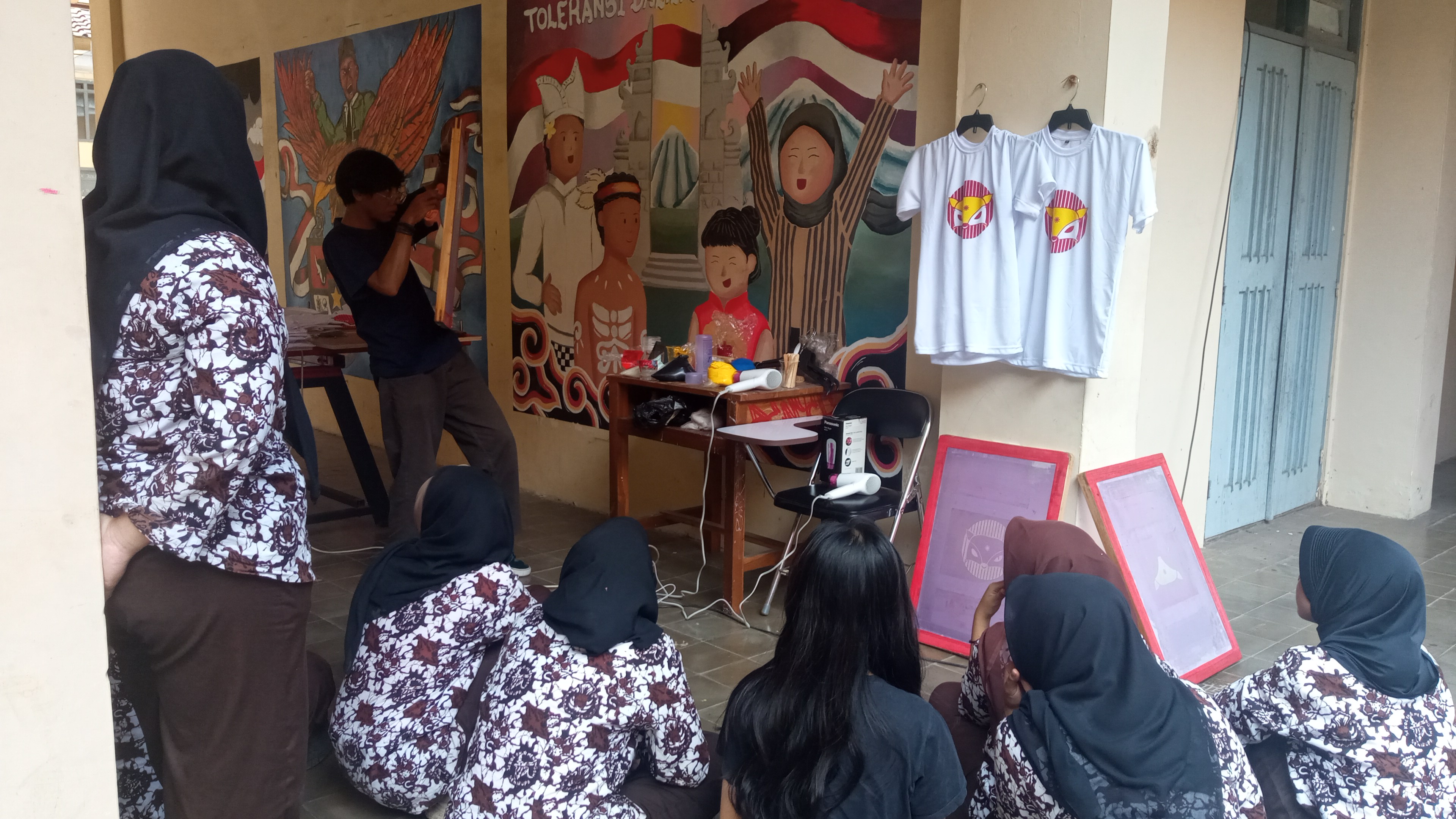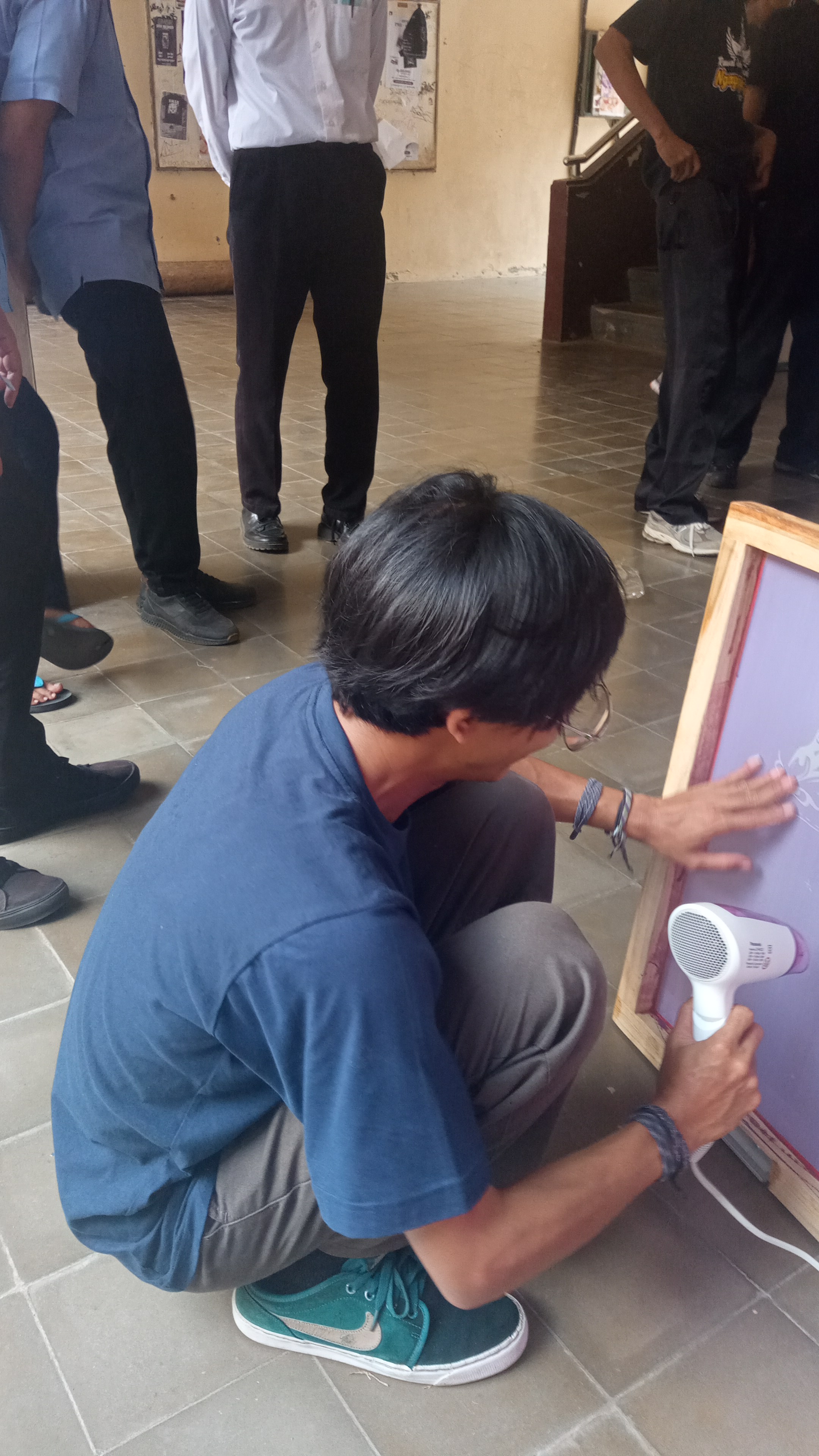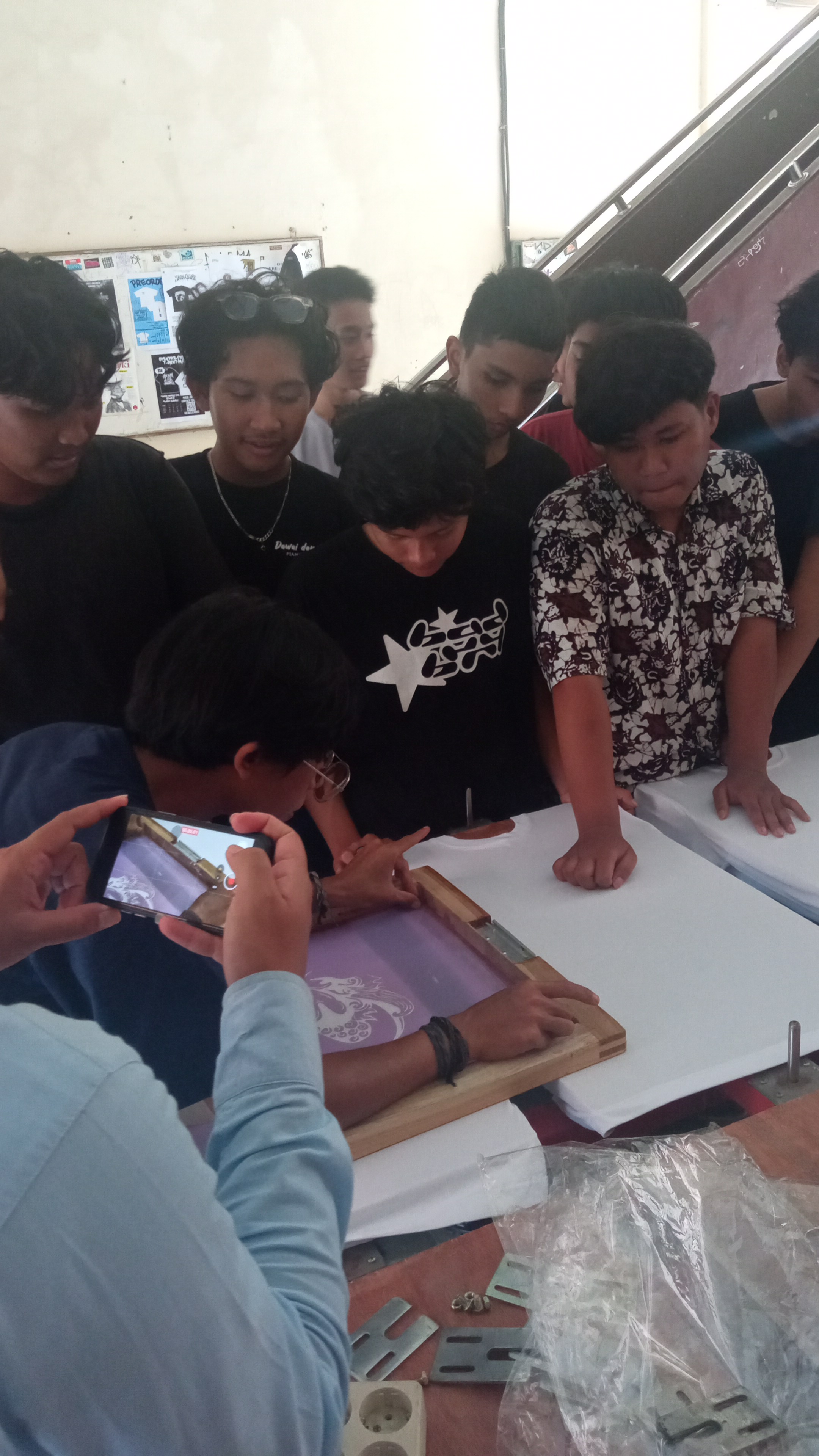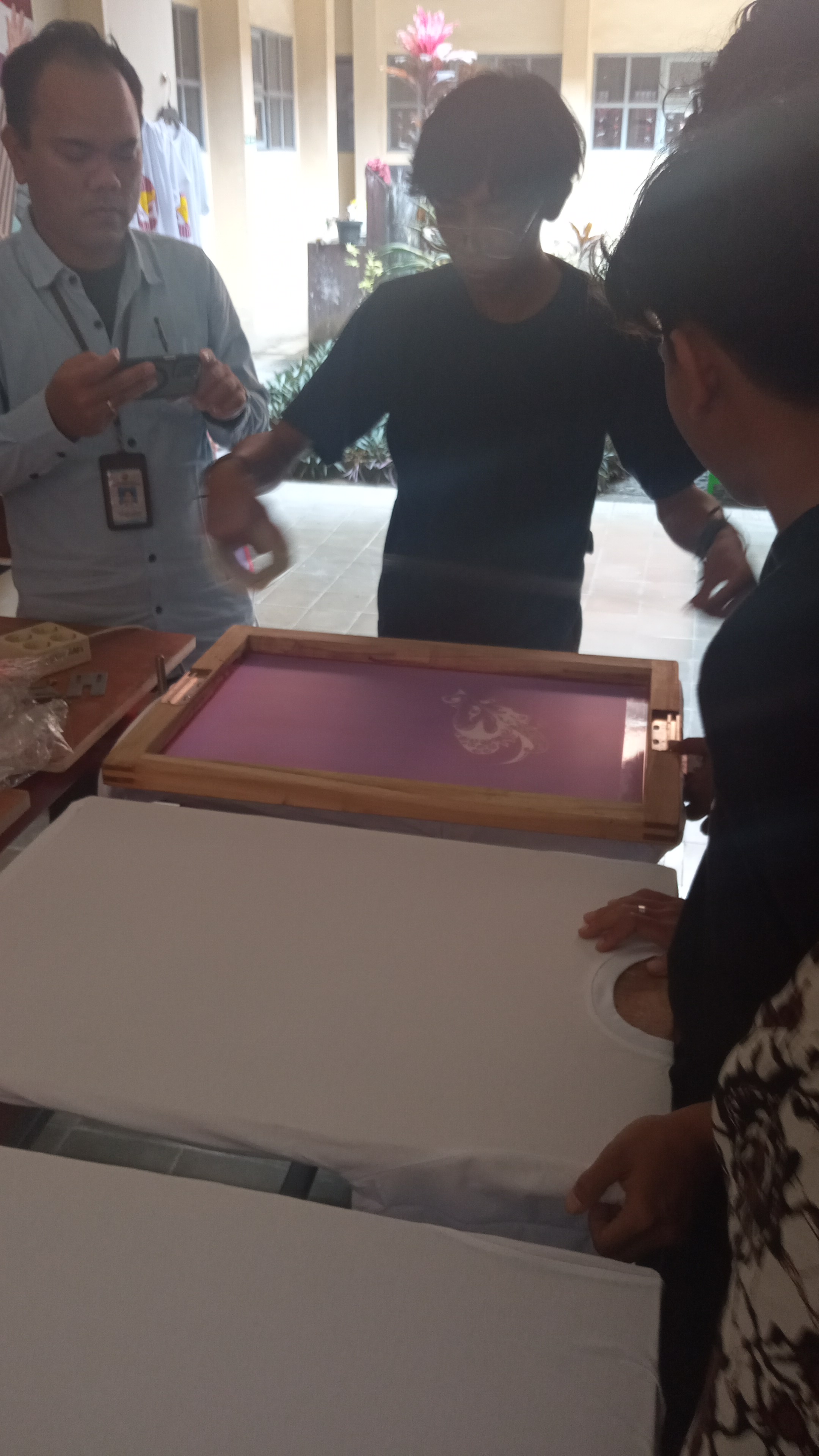 Uji Kompetensi Keahlian yang dilaksanakan adalah praktik sablon manual, yang menguji keterampilan teknis sekaligus kreativitas siswa dalam menghasilkan produk cetak. Sablon manual merupakan teknik cetak yang menggunakan screen (kain saring) untuk memindahkan tinta ke media, seperti kain atau kertas. Dalam konteks UKK DKV, siswa biasanya diminta untuk membuat desain terlebih dahulu, kemudian mencetaknya pada media kaos, tote bag, scraf dan media lain. Proses UKK sablon manual umumnya terdiri dari beberapa tahapan. Pertama, siswa membuat konsep dan desain yang sesuai dengan tema yang diberikan. Desain tersebut harus memperhatikan unsur visual seperti komposisi, warna, dan pesan yang ingin disampaikan. Setelah itu, desain dipindahkan ke screen melalui proses afdruk. Tahap berikutnya adalah proses penyablonan, di mana siswa mengaplikasikan tinta menggunakan rakel di atas screen yang telah disiapkan. Pada tahap ini, ketelitian dan teknik sangat dibutuhkan agar hasil cetakan rapi, tidak bocor, dan sesuai dengan desain. Setelah proses cetak selesai, dilakukan pengeringan dan finishing agar hasil sablon lebih tahan lama.
